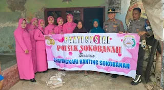 Ketua Bhayangkari ranting Sokobanah. Ny Dewi Anggeraini juga mengungkapkan bantuan sosial yang disalurkan antara lain berupa uang dan paket sembako yang berupa kebutuhan pokok lainnya. selain itu, pihaknya juga menyerahkan santunan kepada anak-anak yatim/piatu.